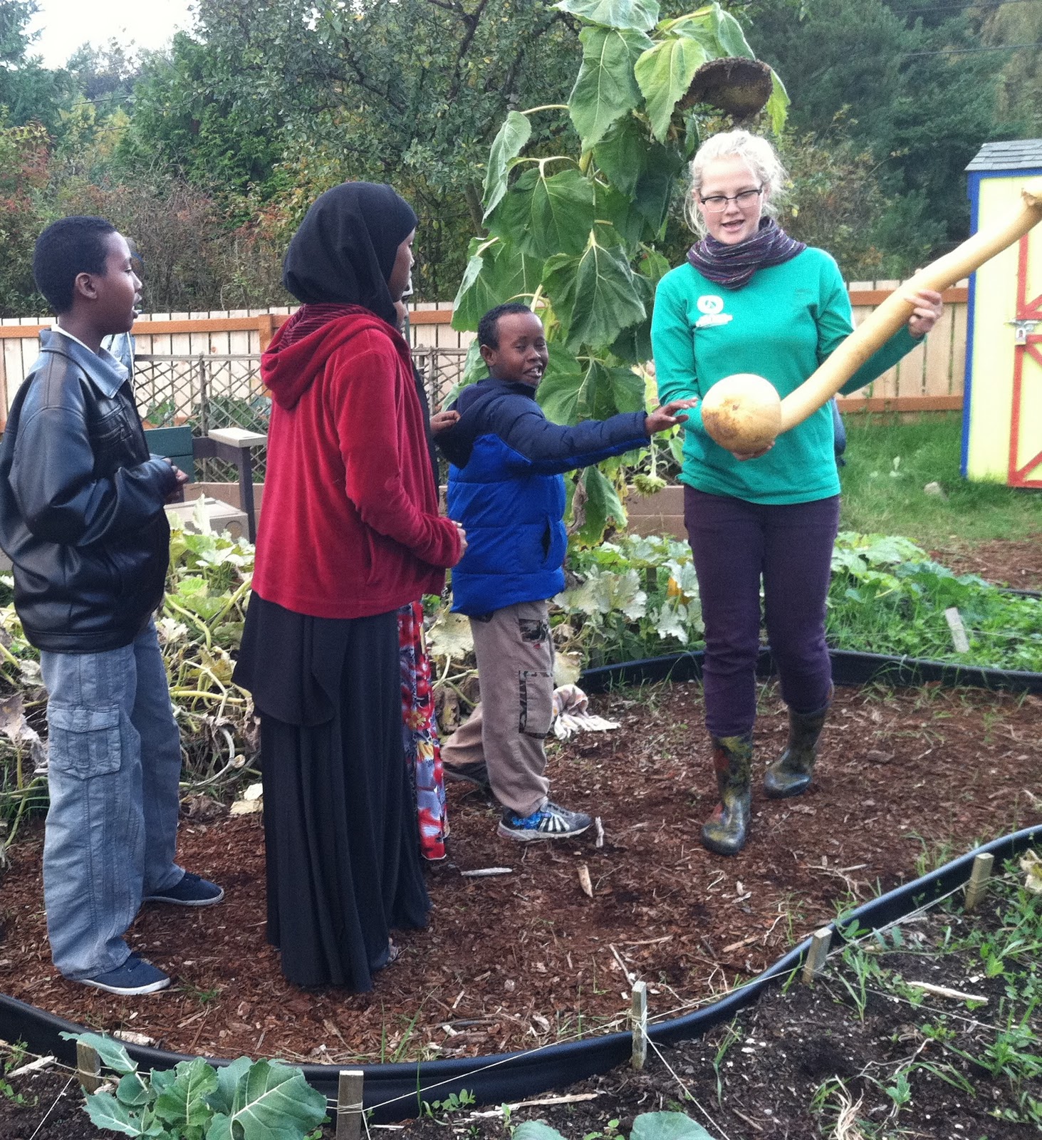| Youth from Somali Community Services meet “Tiny”, our friendly tromboncino squash. |