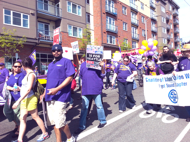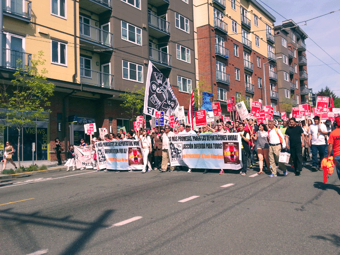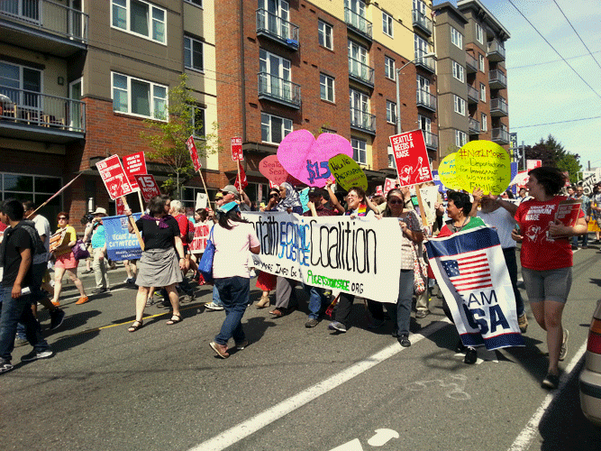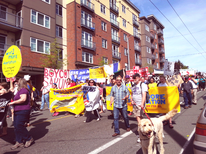 People held signs that read “Health Care is a Human Right” supporting a single payer national health program and “¡Sí se puede!” (“Yes, we can!”), observing the United Farm Workers’ rallying cry so many years ago. Chants like, “Obama! Escucha! Estamos en la lucha!” (Obama! Listen! We are in the fight!) – calling upon the President to curb the over 2 million record deportations that have occurred under his administration – and “What do we want? 15! When do we want it? Now!”— demanding a livable wage of $15 per hour in Seattle proper (and eventually across America) – were heard throughout the march.