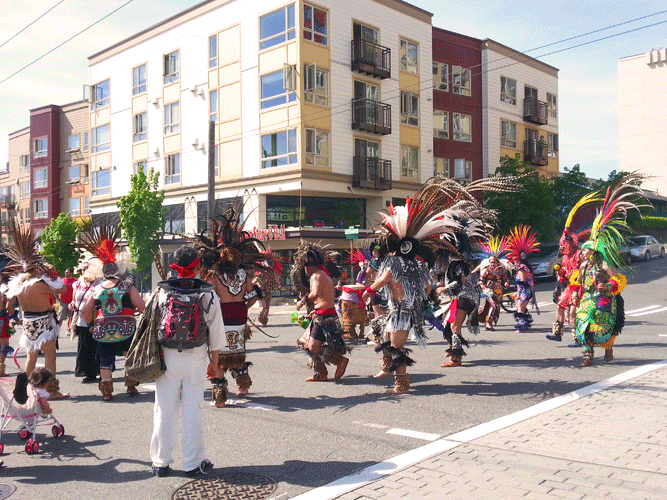 - Aztec dancers lead the march