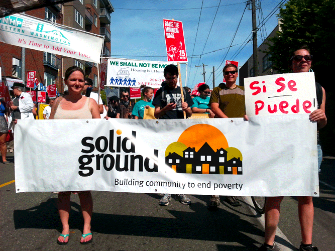 “It was an important day of coming together around issues that affect everyone,” says Leah Grupp-Williams, Food Resources Program Assistant at Solid Ground. In the past, Leah has helped organize the May Day March with the May 1 Action Coalition. This year she planned a group from Solid Ground to attend the march. When asked why this march is so important to her, she replied, “Our current immigration policy is an example of how racism thrives in this country. And it’s important for Solid Ground to continue to have a presence in grass roots struggles.”