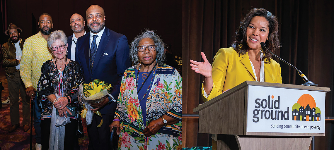 Left: Members of Converge Media, including 50th Gala keynote speaker Omari Salisbury (with flowers) and his mother, the Reverend Harriet Walden (foreground). Right: Solid Ground's CEO Shalimar Gonzales.