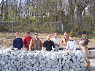 Then they filled the gabions with large rocks. The volunteers carted each and every rock from a pile to the gabions by wheelbarrow – hard work!