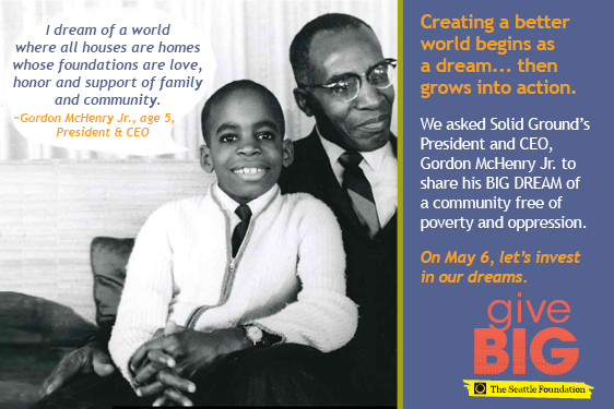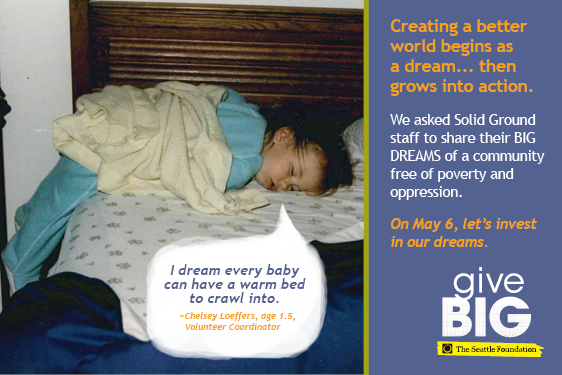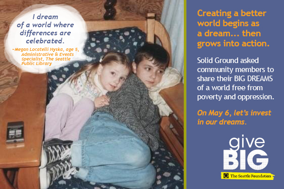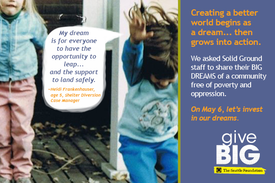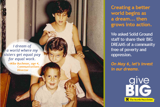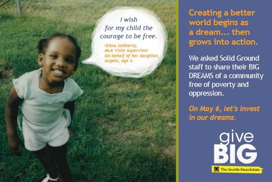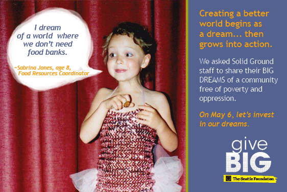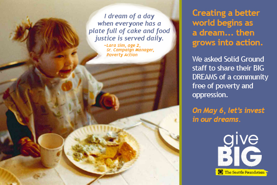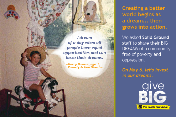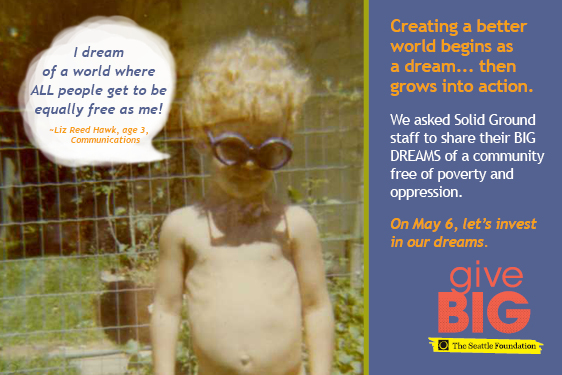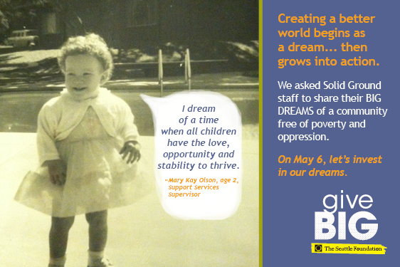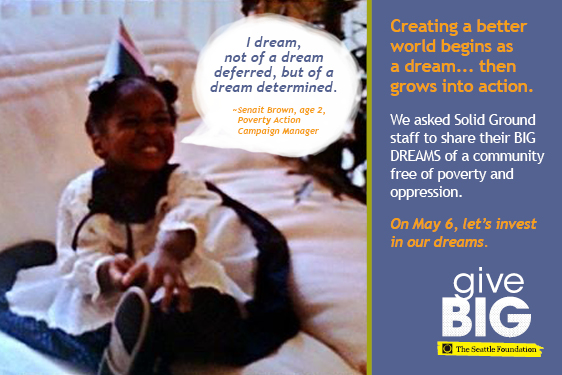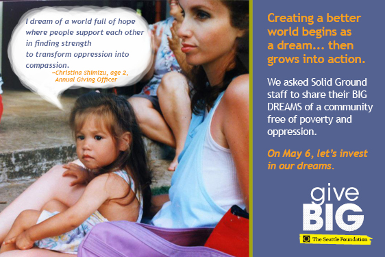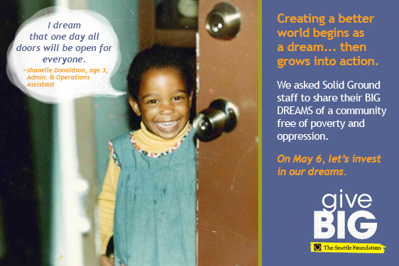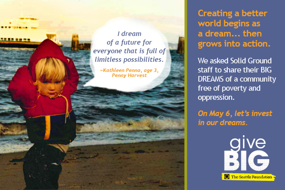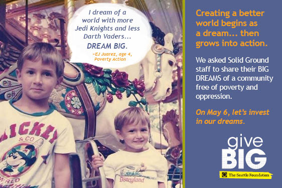 Visit www.tinyurl.com/SolidGroundGiveBIG TODAY (May 6, 2014) to give to Solid Ground. A portion of your gift will be matched via The Seattle Foundation’s gift pool. Your gift is more than just a donation – it’s investing in dreams of a world beyond poverty. Together we can turn these dreams into reality.