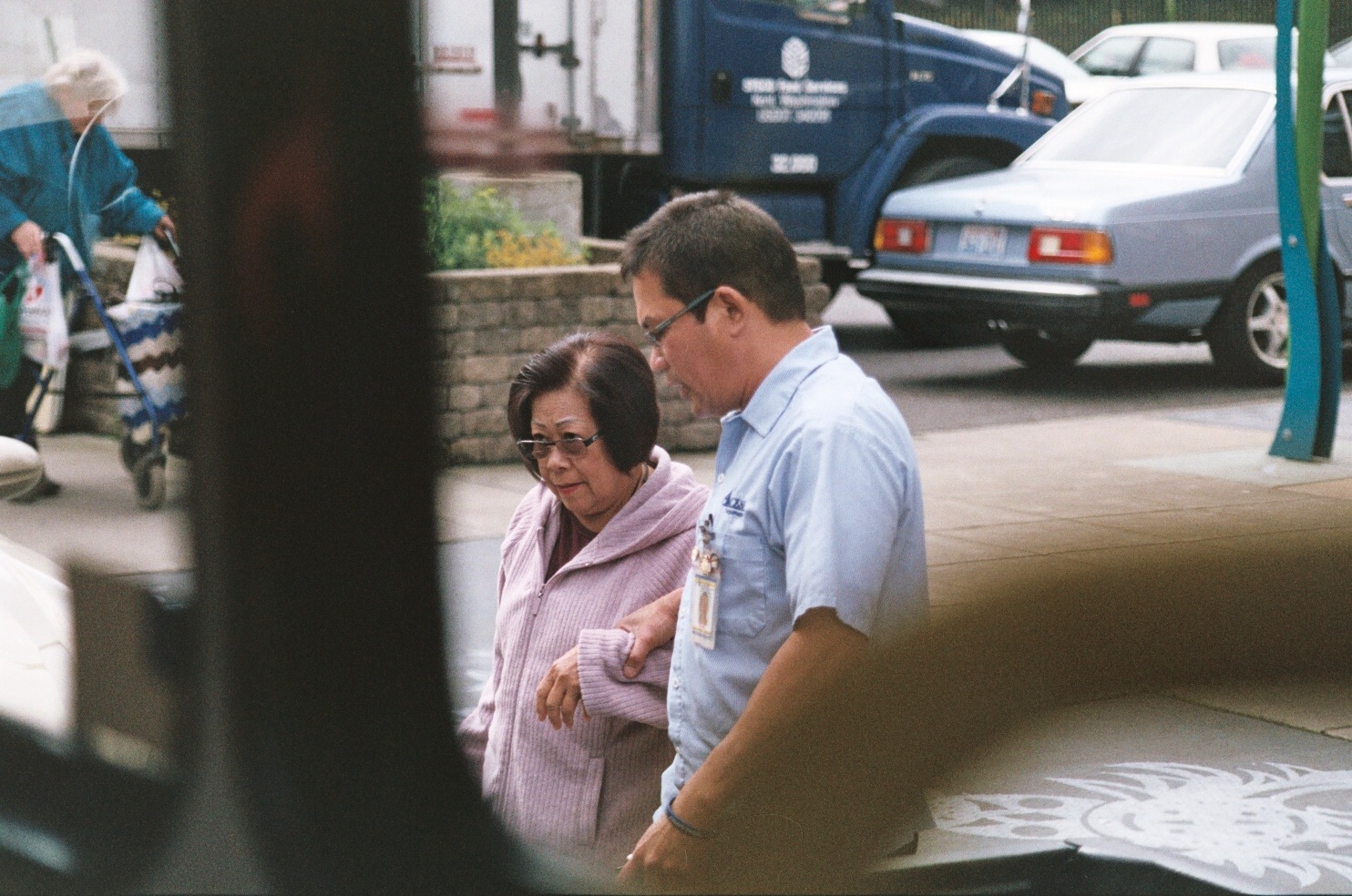 - Viewed through the windshield, Roland escorts a passenger to the van.