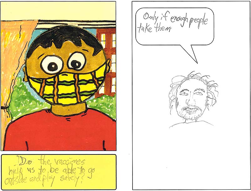 “The Library is excited to celebrate our partnership with the inspiring young leaders of Art Club in Sand Point,” Davida says, which “is all about little leaders having timely civic conversation with big people. Art Club has shared an important child’s-eye view of the pandemic, a time capsule of this remarkable moment we are in. They also have helped deepen conversations around the unique role that artists of all ages can play in helping recovery efforts and addressing healing work after a police killing – a sobering backdrop of the pandemic, unfortunately.”