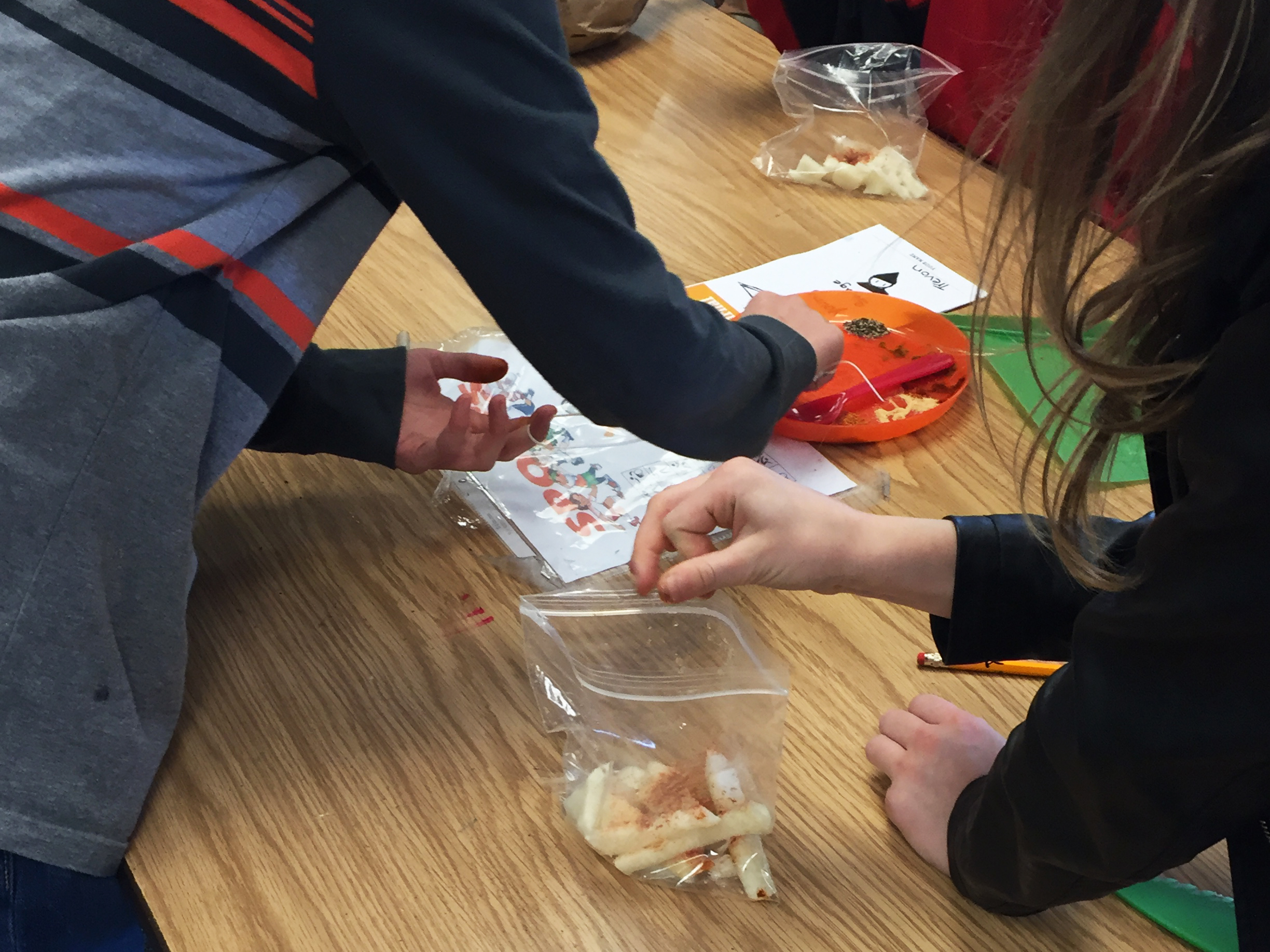 Hands-on activities, including games and preparing recipes, are incorporated into lessons to supplement students’ learning and engagement. Students participate in activities such as creating advertisements and shopping challenges. They also learn how to cook up healthy recipes such as rainbow salsa.