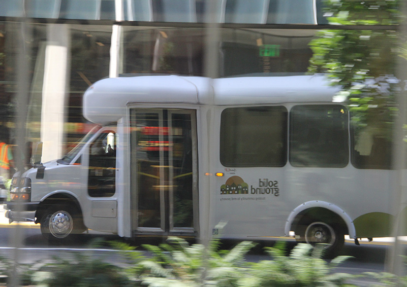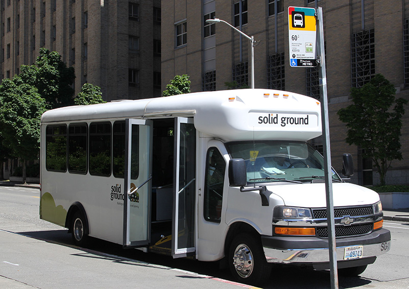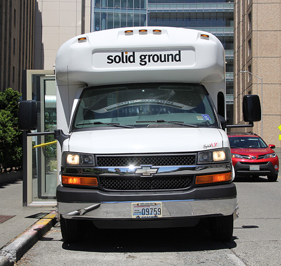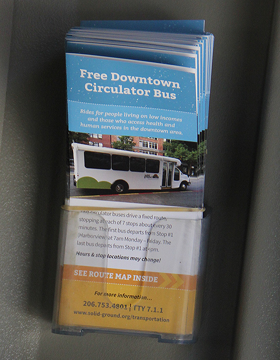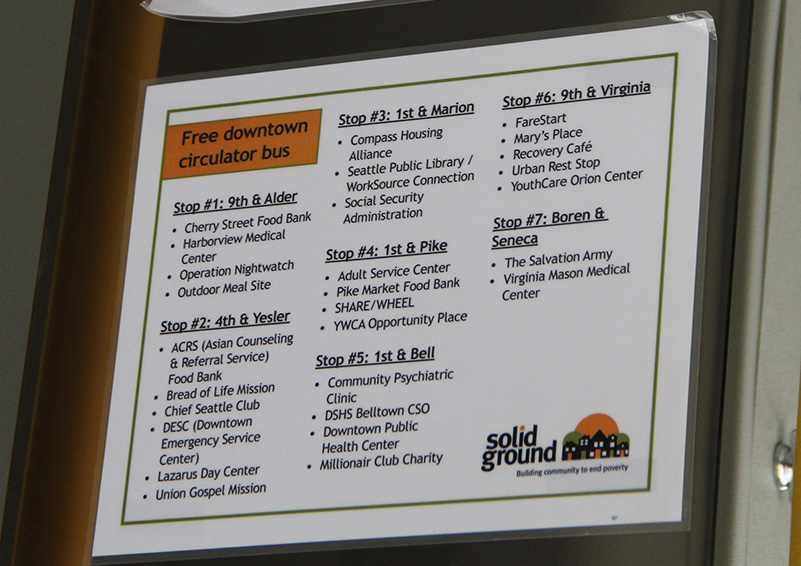 For people living on fixed or very low incomes who use human services in downtown Seattle, getting around town in our notoriously hilly city can be a challenge. For many, walking isn’t an option – and for others, bus fare is nonexistent. So to help residents access essential services critical to their health and well-being, Solid Ground’s Seattle Downtown Circulator Bus provides free weekday rides along a fixed-route, seven-stop circuit.