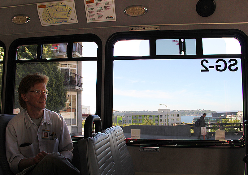 Randy, born and raised in Seattle, comments, “Yeah, this is a BIG hill for me; I only got one full lung. I run out of breath very easily.” Randy’s been riding the Circulator about three years. “This service here has been nothing but a blessing. It saves me a lot of money, because I live on a very fixed income. And during the winter, this is a huge help. Big-time help.”