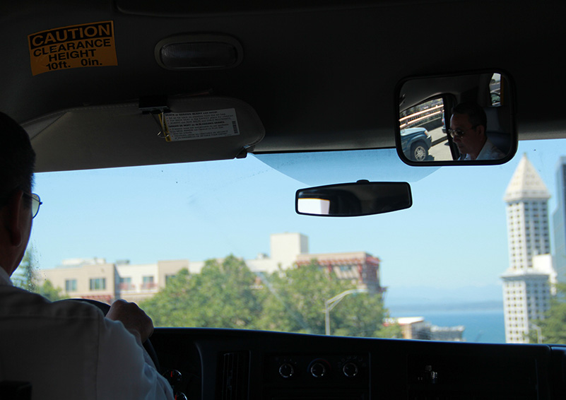 He adds, “Also there’s a ferryboat that gets off and unloads all these cars, so it can take five or 10 extra minutes just in that one section of street.” There are benefits too though. “I get to see the sun rise, and I never get tired of that view going down Yesler where you see the Smith Tower and the ferryboat.”
