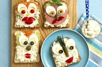 - Have kids make faces on bread, using the sliced egg eyes and decoration ideas above