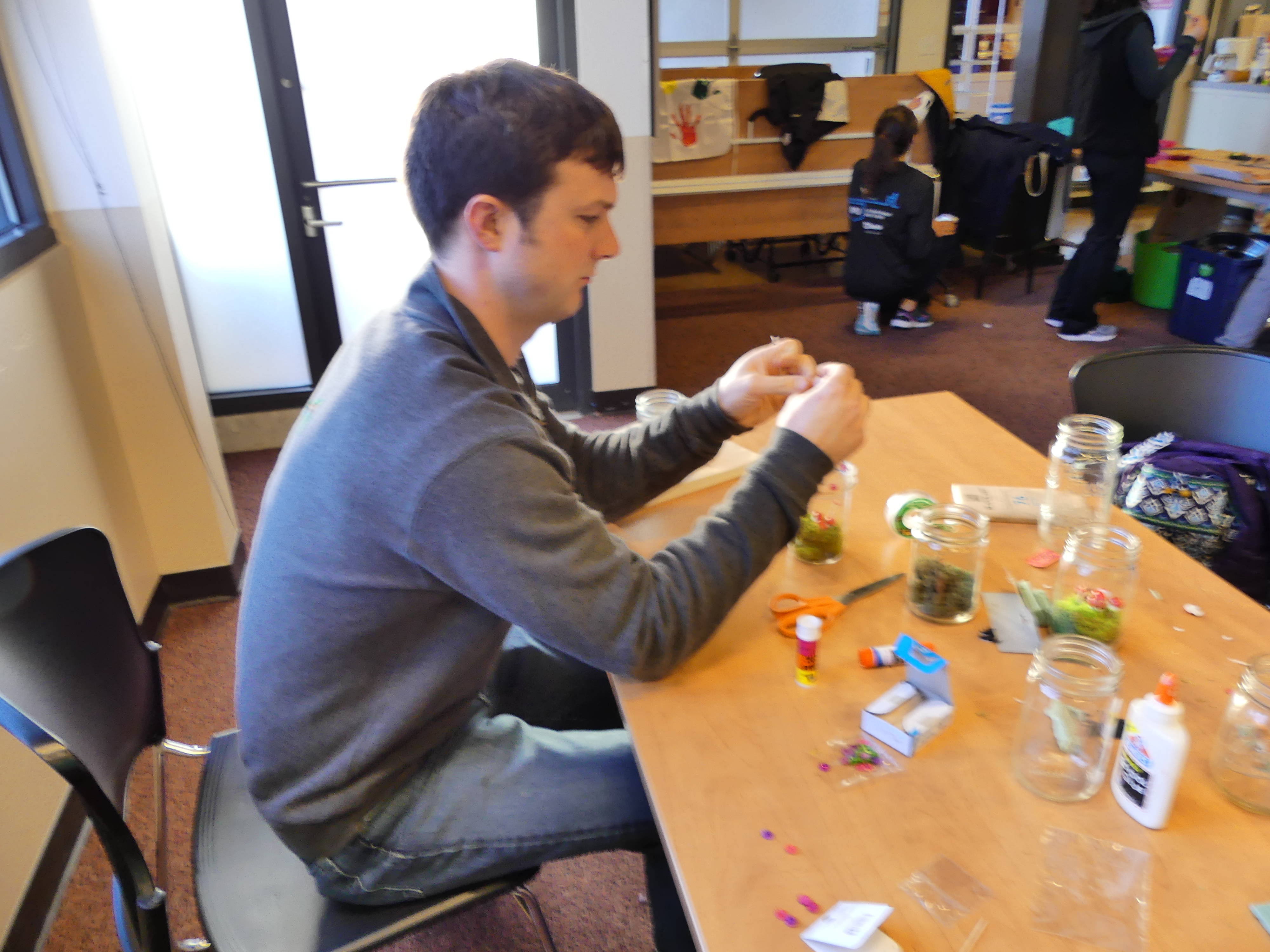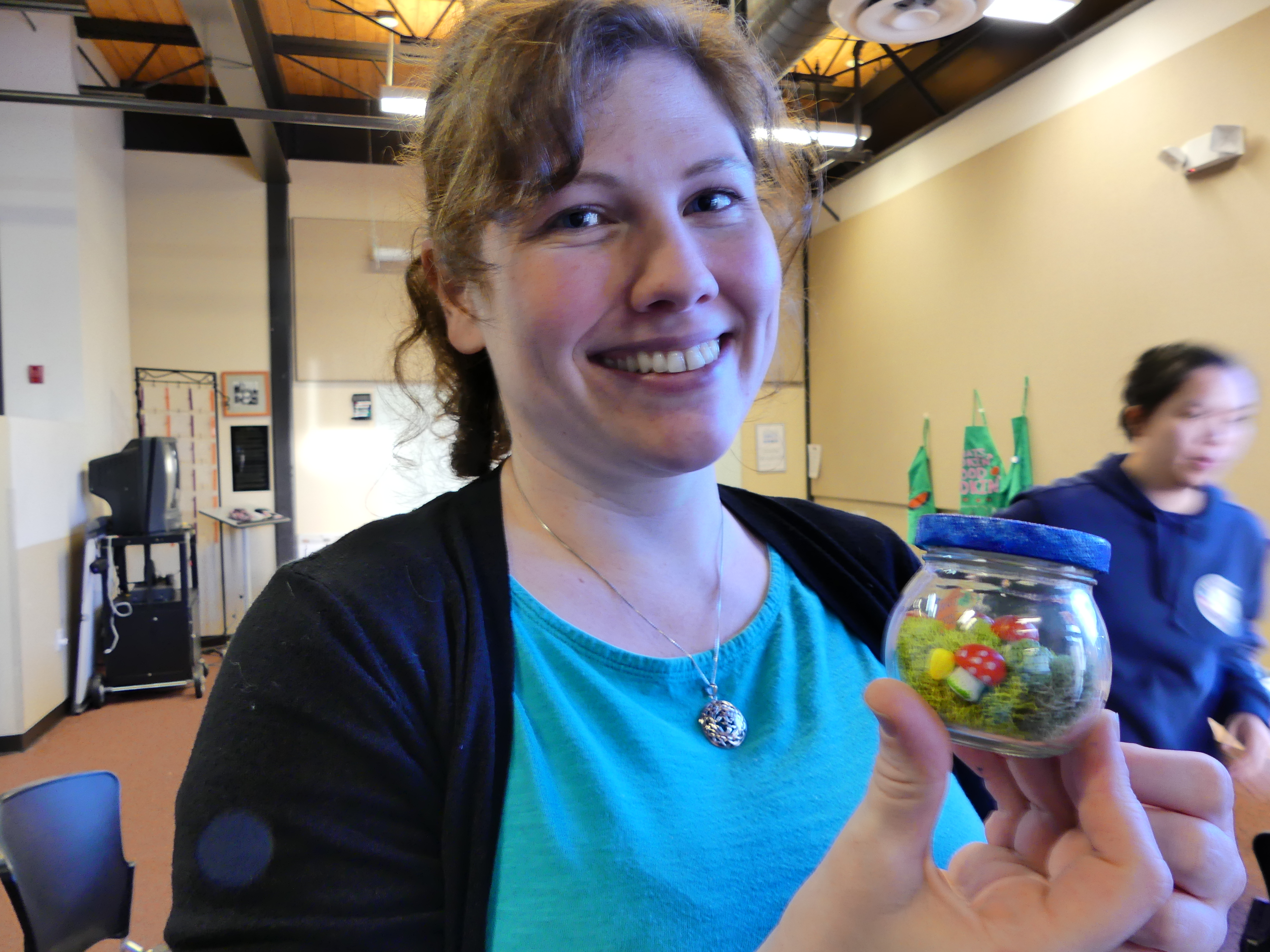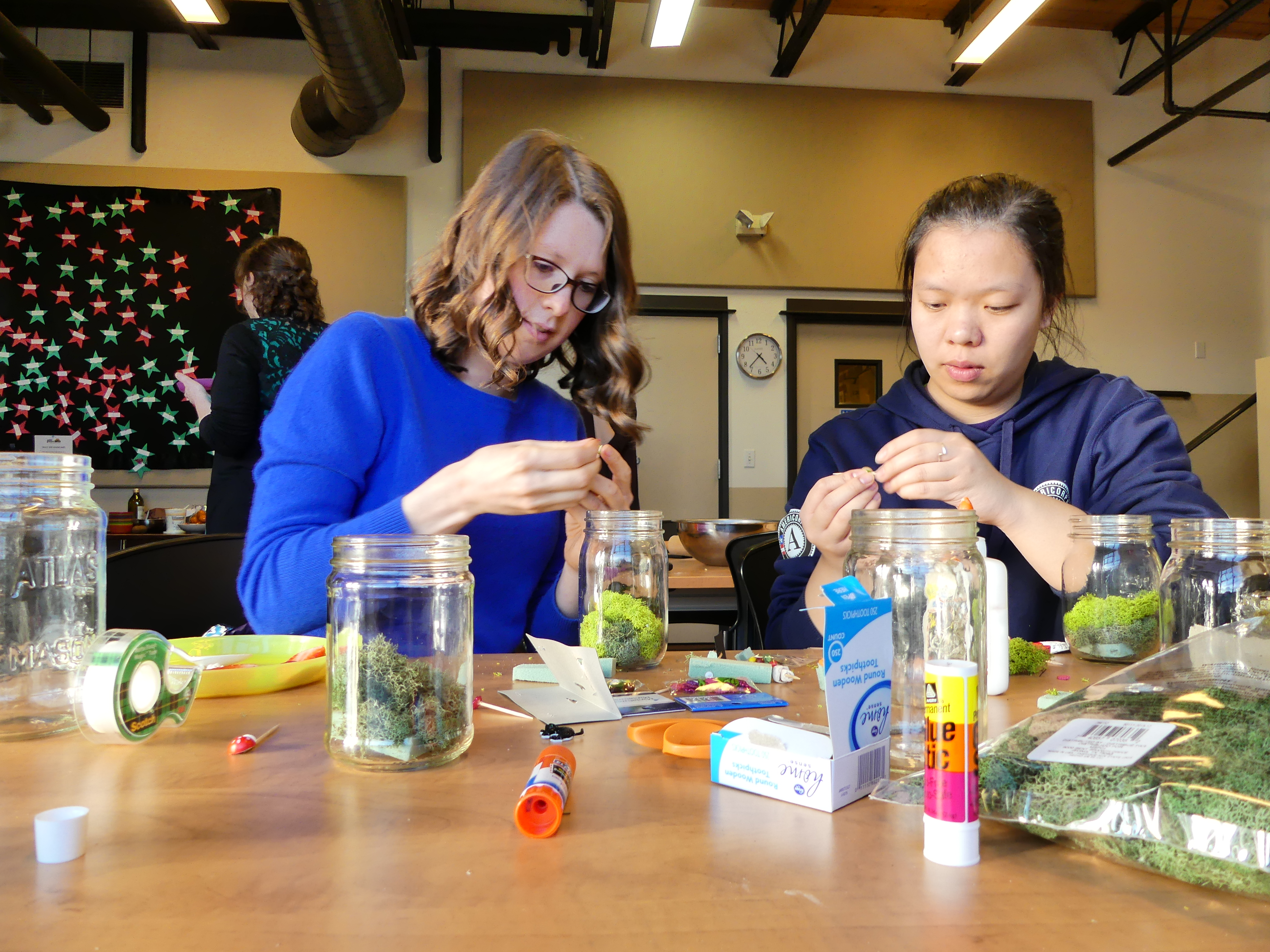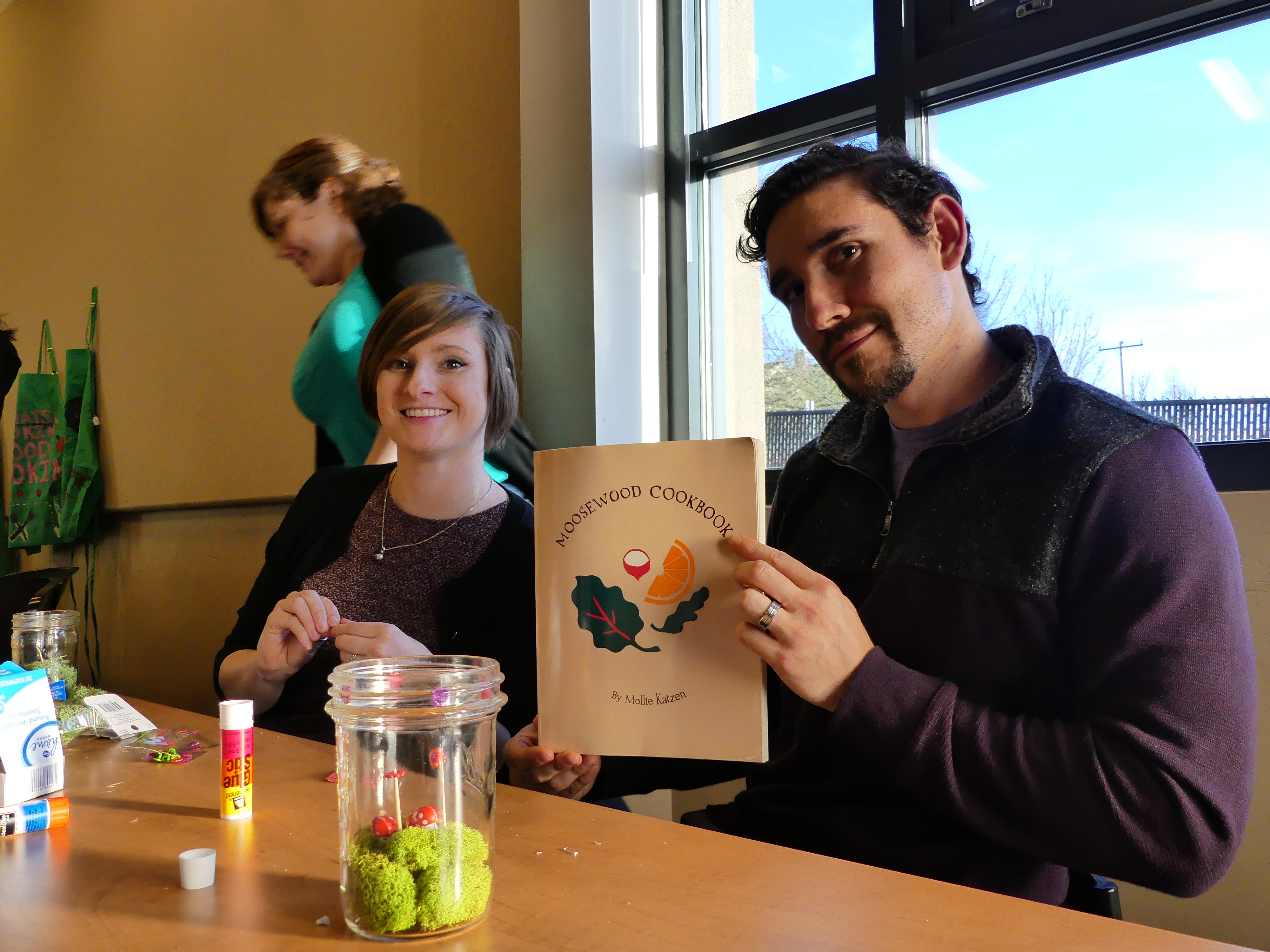 While our terrariums looked daunting at first, everyone was able to bring out their crafty sides and build little mushroom and vegetable gardens or even a giant tree, as Ben successfully took on. Erika was able to tackle the challenge of our smallest jar and accomplished a magical mini garden, with a mini p-patch sign to spare. Even Tena and Ashley (The winners of our cookbook raffle) have decided to take on terrarium building as their newest hobby, filling their house with as many terrariums as possible. (For that last case, I may or may have not exaggerating the impact of this project…)