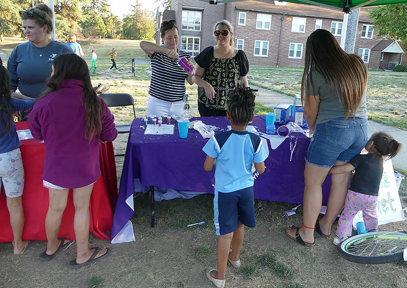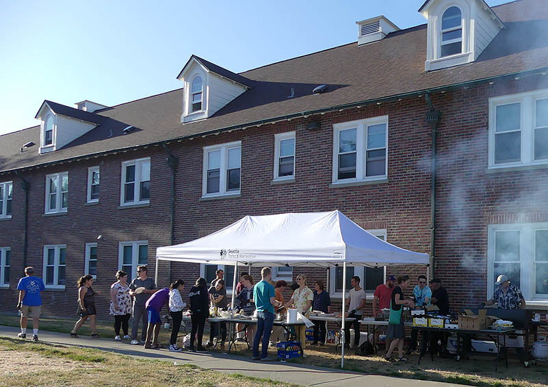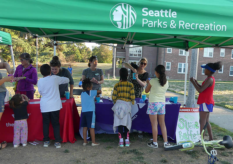 Charlisse Hammon, Solid Ground Children’s Program Manager sums up the evening: “It had a nice flow, and it was a good turnout!” – evidenced in part by the amount of barbeque consumed: “We gave out 400 hamburgers and 250 hotdogs!” Yet another valued partner, OneLife Community Church, which serves regular weekly summer dinners on the Sand Point Family Lawn, prepped and cooked the food. “They normally cook for 60-70 people on the campus,” she says, “so it was a huge undertaking to cook for more than 300 people. The church volunteers worked longer hours for this event and were helpful with setting up and cleaning up after.”