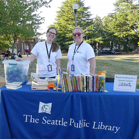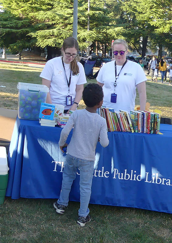 Librarian Robin Rousu with The Seattle Public Library’s Mobile Services says, “The Library’s been working with Brettler Family Place since it opened, and mobile services has been coming for the last four years. We’ve been coming every week this summer to Brettler and doing art with the kids, and it’s been fantastic – so we’re really happy we could be here at the end-of-summer party and bring free books and stress balls to give away for the start of school – for parents AND kids!” The event gave them the chance to have “some great conversations about books, and some great conversations about the library and getting people connected to resources.”