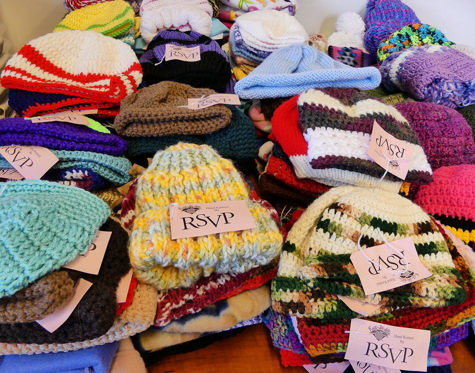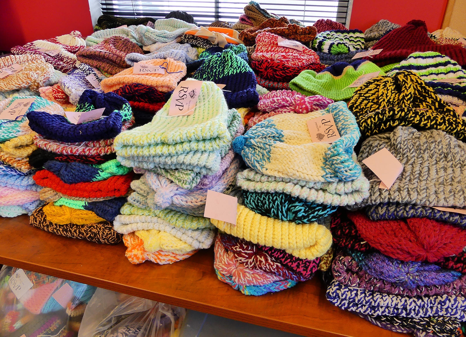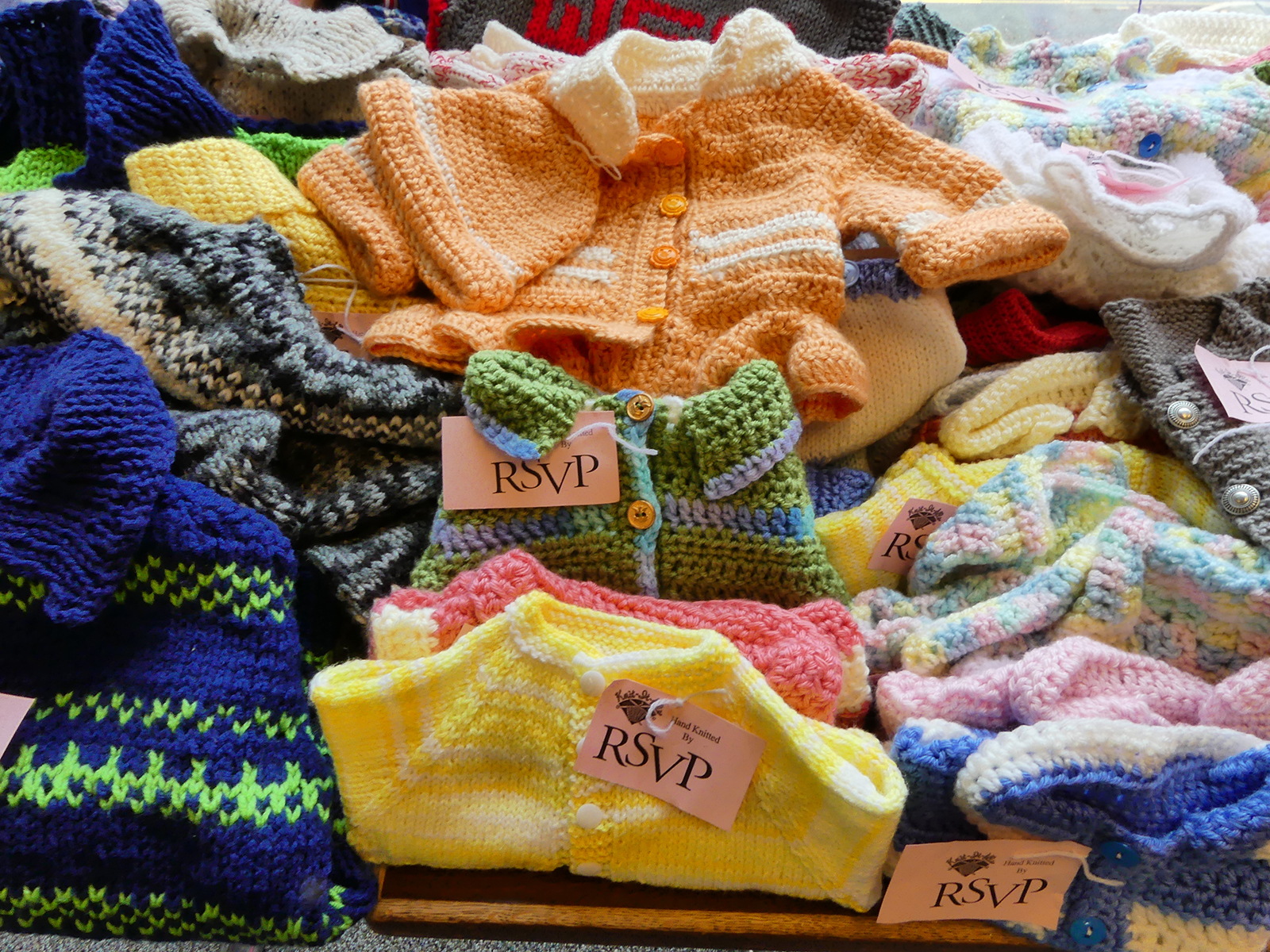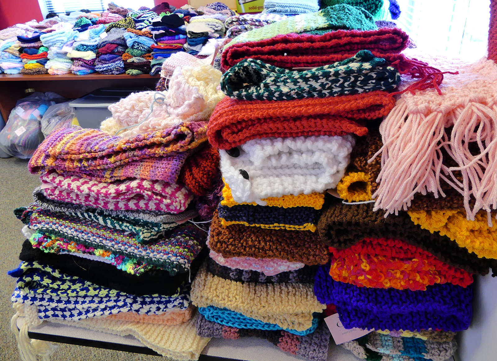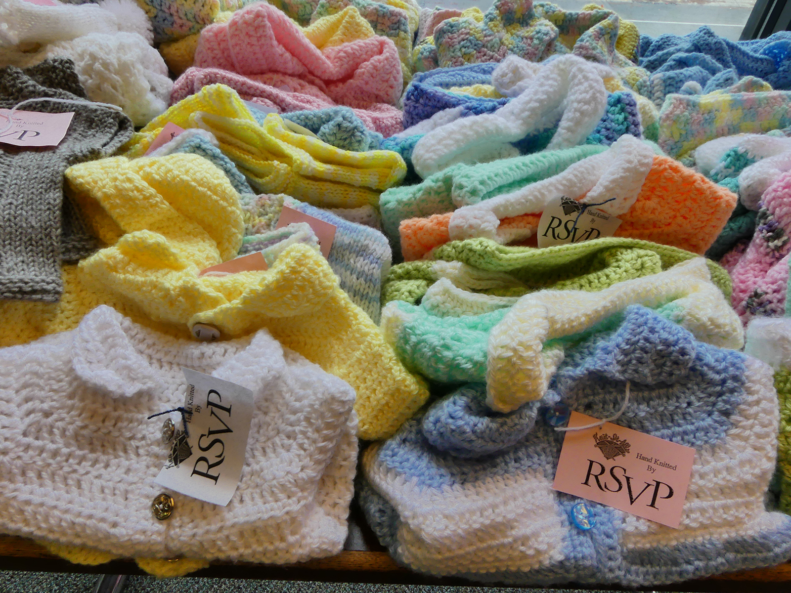 Laid out in neat piles before being packaged for distribution, the items look like candy in a store display: an explosion of cozy, kaleidoscopic color. My personal favorites are the baby sweaters, which one volunteer described as “miniature works of art.”