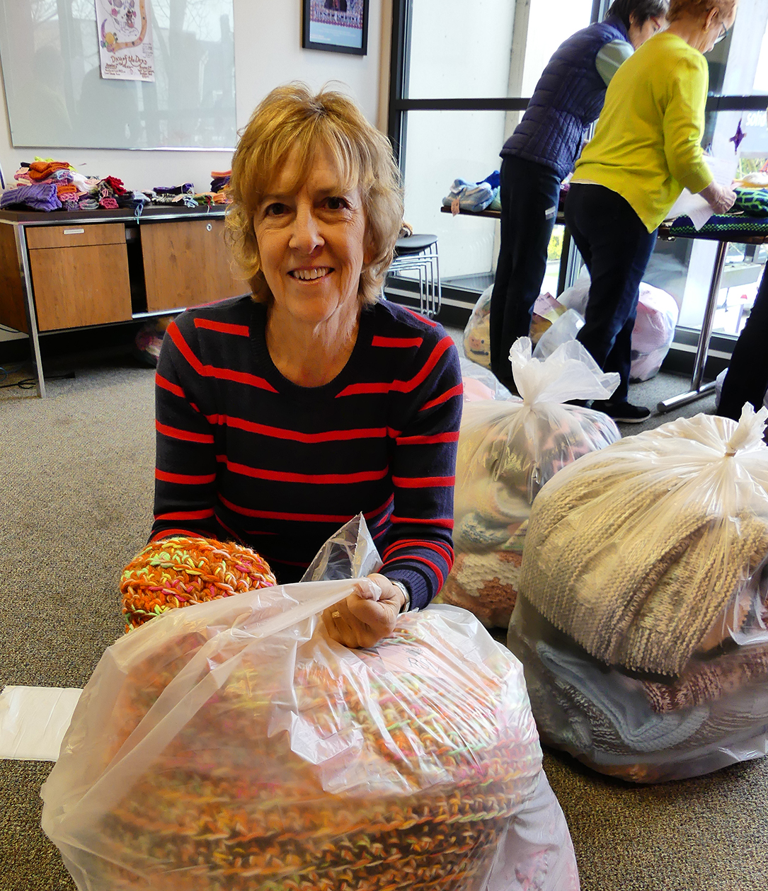 For over two decades, Knit-It-Alls (KIA) volunteers from Solid Ground’s Retired and Senior Volunteer Program (RSVP) have quietly created mountains of warm items. RSVP gathers them together at the start of the holiday season to package and distribute to nearly 25 local housing programs, food banks, and other community organizations. The agencies in turn get them to people in need across King County.