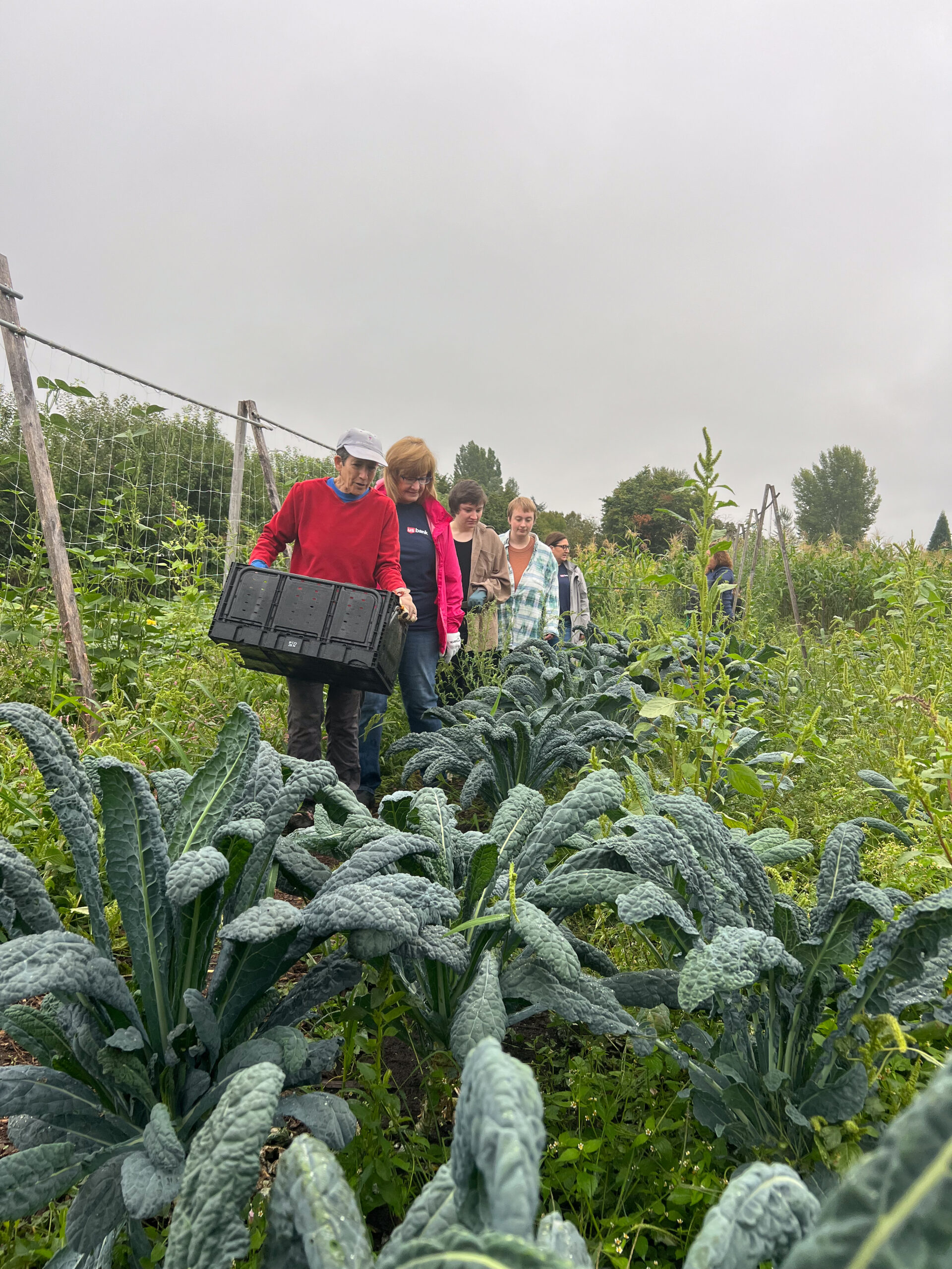 Volunteers make their way past a row of kale at Marra Farm (photo by Clarissa Magdich).