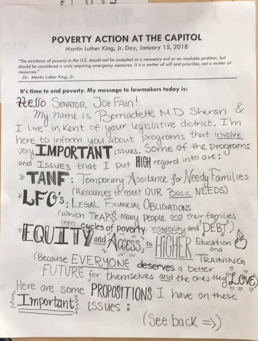 MLK Day launched this year’s Washington State Legislative Session, which is “short”: Legislators have just 60 days to consider bills and pass a supplemental budget. Poverty Action has a full slate of policy priorities – developed in partnership with community members – which we will work to advance this year. You can download the full 2018 Policy Agenda, including in-depth Racial Equity Analyses for each priority area, but the following is a synopsis of the 2018 priorities and positions: