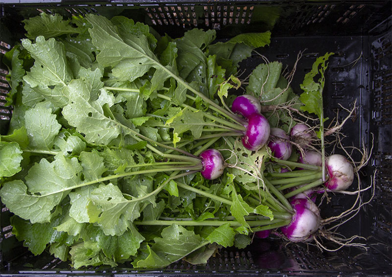 A harvest of Asian daikon radishes, a favorite among ACRS volunteers & program participants (photo by Lara Breitkreutz)