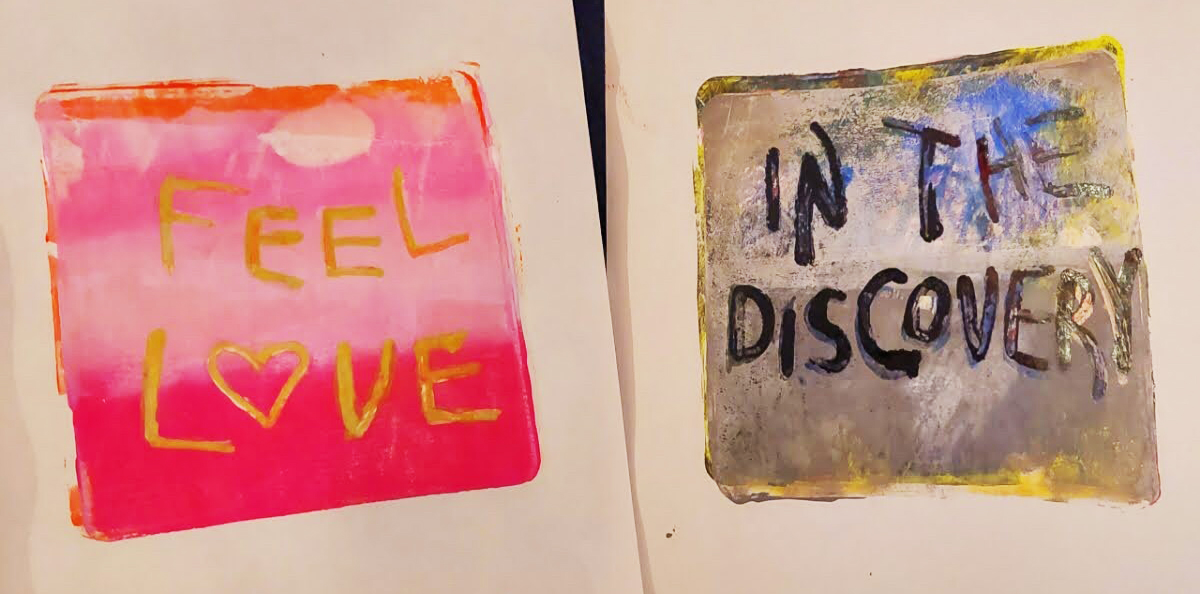 Among the easels, brushes, and tubes of paint in Michelle Flickinger’s Solid Ground apartment, a new mixed-media project is just starting to take shape. For now, it’s a heart-shaped canvas with a phrase painted in blue and gray: “I have the will. I know the way.”