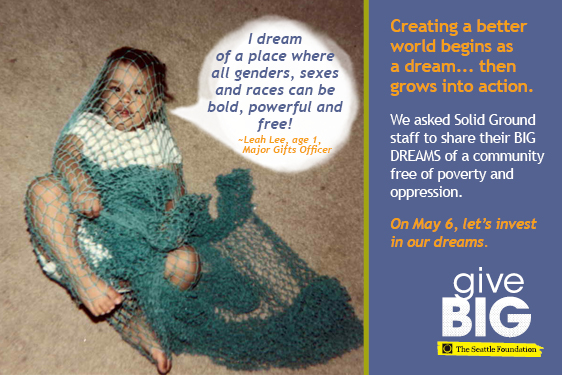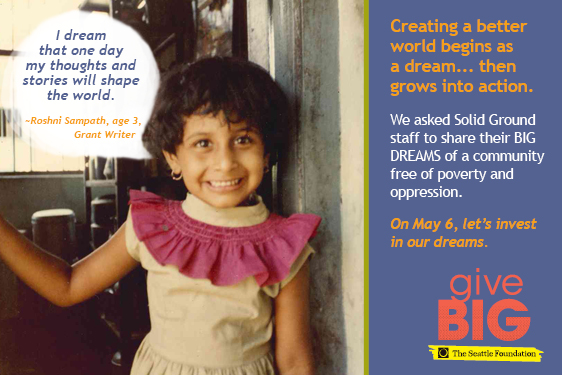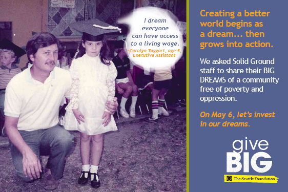 Visit www.tinyurl.com/SolidGroundGiveBIG TODAY (May 6, 2014) to give to Solid Ground. A portion of your gift will be matched via The Seattle Foundation’s gift pool. Your gift is more than just a donation – it’s investing in dreams of a world beyond poverty. Together we can turn these dreams into reality.